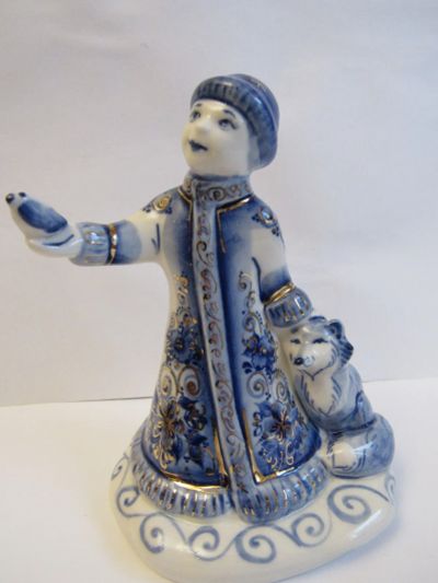 Головка и руки Снегурочки отлиты из фарфора бисквит, лицо расписано вручную акриловыми красками. Шуба и шапочка из парчи, оторочены искусственным мехом, все материалы новые и без запаха. Высота куклы 28 см.
