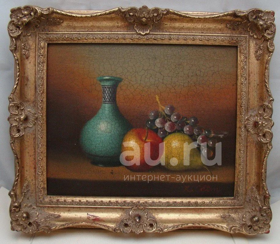 Дерево, акрил? Лак, имитация кракелюра. Рамка дерево, лепнина. Размер: 35х30 см.