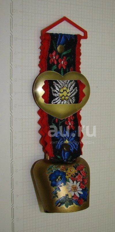 Сталь, ремешок ткань, вышивка. Высота с ремешком 14 см, колокольчик: 5х4,5х3 см. Потертость.