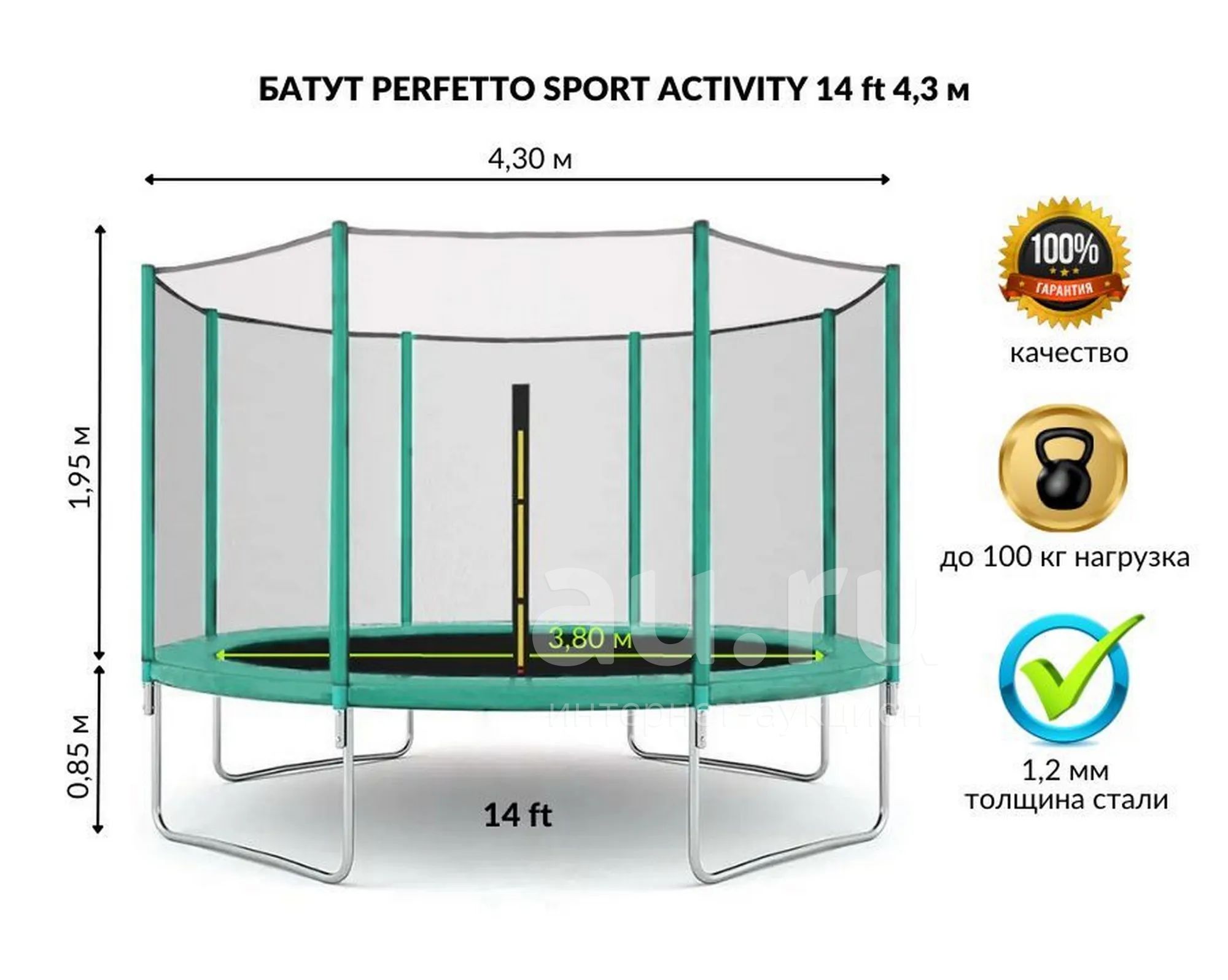 основная информация батут с защитной сеткой quot;perfetto sport 14 quot;- это идеальный спортивный аттракцион для ваших детей. наш батут оборудован защитной сеткой и лазом застегивающимся на молнию.внутри батут имеет мягкий мат, который надежно защищает ребенка от любых падений, а вертикальные стойки защищены мягкими чехлами прыжки на батуте вызывают восторг у детей, приносят им радость и помогают в их физическом развитии! совершенствуется координация и чувство равновесия, развивается вестибулярный аппарат, формируется выносливость и укрепляются мышцы тела. всего 15-20 минут прыжков на батуте заменяют час изнурительных тренировок в тренажерном зале, а 10 минут пробежку дистанции в 3 км батуты quot;perfetto sport quot; изготовлены по евро стандарту и обладают целым рядом преимуществ которые выделяют наши батуты на фоне конкурентов: защитная сеть входит в комплект всех моделей батутов диаметром более 1,4 м, в данной модели сеть проходит по внутреннему диаметру и разделяет прыжковое полотно от пружин, что обеспечивает дополнительную безопасность ваших детей, она надежно крепится к прыжковому полотну, все металлические части батута находятся за пределами досягаемости каркас батута изготовлен из стали с полимерным двусторонним покрытием, нанесенным методом холодной гальванизации прыжковое полотно изготовлено из высококачественного материала перматрон (permatron, сша) - качество высшей категории, проверенное временем, оно устойчиво к изменению погоды, вы можете не беспокоится о батуте оставляя его под дождем, по краю полотно имеет 6 – 8 строчек (по качеству строчки можно судить о качестве батута) безопасные пружины батутов quot;perfetto sporrt quot; доказали свою надежность, безупречное качество и высокие прыжковые характеристики защитная сеть батутов изготовлена из плетенной нити с повышенной прочностью, что обеспечивает надежность при использовании и высокую защиту от ультрафиолета защитный мат произведен из pp mesh fabric первичного полипропилена что означает что первая переработка абсолютно не токсична и безопасна для использования детьми радуйте себя и ваших детей, мы хотим чтобы у них было всё самое лучшее! дополнительные характеристики страна происхождения: китай материал защитного мата: pp mesh fabric кол-во стоек сетки: 8 шт диаметр стойки сетки: 25 мм диаметр ножек: 40 мм толщина стали: 1,2 мм каркасный: гальванизированная сталь, диаметр рамы 40 мм назначение: для улицы возрастная категория: 3+ упаковка: картонная коробка комплектация: батут, стойки для защитной сети, защитная сеть