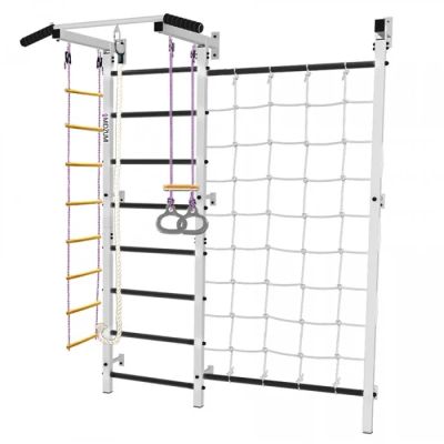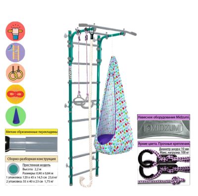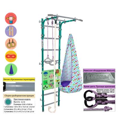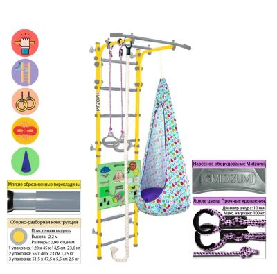 основная информация детский спортивный комплекс midzumi hogo kabe хорошо впишется в интерьер любой квартиры, так как он занимает мало места, 1-2 квадратных метра, компактный и его легко собрать. модель многофункциональна благодаря популярному набору навесного оборудования: кольца, канат и качели-кокон. дополнительные характеристики конструкция: сборная-разборная обрезиненные перекладины длина пристенных кронштейнов (от стены до стойки): 19 см размер выноса турника (от стойки): 60 см ширина лестницы от края до края стоек без учета выступающих креплений: 55 см ширина лестницы от края до края стоек с учетом выступающих креплений: 59 см ширина лестницы внутри от края до края стоек: 46 см расстояние между ступенями лестницы от края одной до края другой ступеньки: 24,5 см длина захвата турника: 90 см вид комплекса г-образный комплектация: основа - металлическая шведская стенка с турником, гимнастические кольца, канат, качели-кокон.