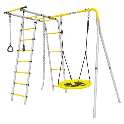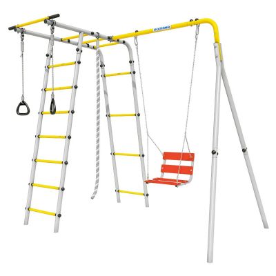 основная информация детский спортивный комплекс для дачи обеспечит много часов веселого досуга детям и взрослым на свежем воздухе. комплекс включает в себя разнообразное оборудование: канат, кольца, гимнастическая лестница, неподвижный турник. тренажер можно дополнить разными видами качелей. конструкция неполной лестницы позволяет выполнять различные упражнения (гимнастические, разминочные, для растяжки и пр.), а также прекрасно подойдет для обучения ребенка подтягиваниям на перекладине. если хотите получить две полноценные лестницы, можно докупить три ступени в разделе дополнительного оборудования. для расширения функционала можно дополнить комплект сеткой лазом и баскетбольным щитом. разнообразие игровых элементов расширяют возможности комплекса и способствуют всестороннему физическому развитию ребенка. прочность конструкции обеспечивает безопасные условия для совместных занятий детей и родителей. допустимая нагрузка на комплекс с турником, а также на рукоход 100 кг, на детское навесное оборудование (канат и кольца) - до 50 кг. установка: в целях обеспечения надежности конструкции, необходимо соблюдать несколько правил при установке комплекса. площадку для монтажа требуется выровнять. зона безопасности составляет 7550х4000мм. комплекс необходимо бетонировать на закладные конструкции (грунтозацепы, которые поставляются в комплекте) на глубину 550мм. установка дополнительного оборудования осуществляется только после полного застывания бетона. дополнительные характеристики страна происхождения: россия способ установки: цементируются «стаканы» материал: металл занимаемая площадь: 2,27 х 1,65 м диаметр трубы: 42 мм толщина металла стоек: 1,5 мм толщина металла качельной балки 3 мм диаметр ступени: 26 мм ширина ступени: 0,49 м шаг ступени: 0,26 м допустимая нагрузка на турник: 100 кг допустимая нагрузка на навесное оборудование: 50 кг упаковка: картонная коробка комплектация: канат, кольца, гимнастическая лестница, неподвижный турник, качели фанерные