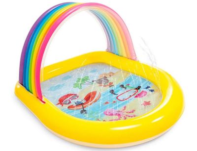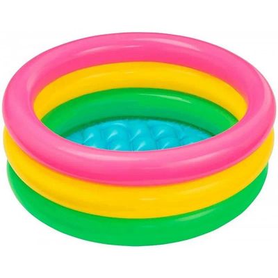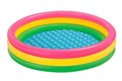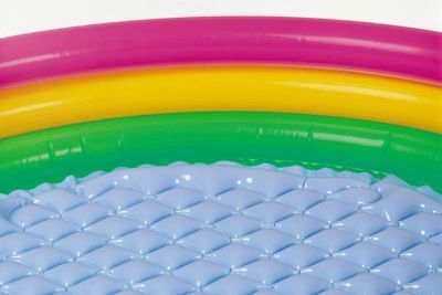 основная информация пестрый бассейн «радуга» с мягкими надувными бортиками для детей от 3 лет. отлично подходит и для купания на даче, и для того, чтобы взять его с собой в отпуск. сделан из прочного винила. размеры: 168х46см. дополнительные характеристики объем: 617 л при 90% заполнении время сборки: 10 минут страна производства китай комплектация: надувной бассейн сливной клапан ремонтный комплект фирменная упаковка насос для накачивания изделия воздухом в комплект не входит