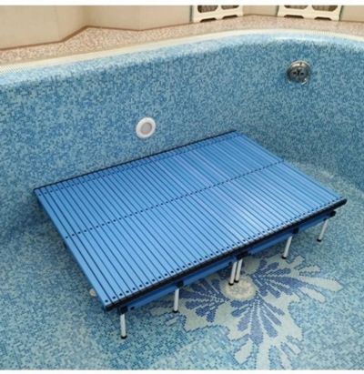 основная информация платформа для поднятия уровня дна в бассейне представляет из себя помост из нержавеющих материалов, просто ставится на дно бассейна. можно установить несколько модулей вплотную, они связываются между собой специальными пластиковыми стяжками. если нужно из глубокого бассейна сделать детский, или для занятий с маленькими детьми (поднять уровень дна), то для этого и существует наша разработка. модуль платформы устанавливается на дно бассейна без необходимости слива воды - то есть ставить его нужно прямо в воду. платформа имеет широкий диапазон стандартных размеров: от 100?100 см до 200?150 см. конструкция для второго дна очень прочная - можно спокойно ходить по модулям даже без воды. вес самого большого модуля 150*200 - порядка 80 кг. вместе с грузами, поэтому стоит модуль очень устойчиво. в высоту второе дно может быть от 25 см. до 1 метра, стандартные высоты - 60 см или 1 метр. можете заказать такую высоту какая вам нужна, обычно заказывают высоту модуля исходя из того чтобы получить глубину бассейна 60-80 сантиметров - это наиболее удобная глубина для детей. поверхность платформы имеет противоскользящее покрытие. материал модулей - полипропилен, внутри каркаса используется также алюминий и крепеж из нержавейки а4, то есть модули quot;второго дна quot; полностью нержавеющие. платформа имеет утяжелители, благодаря которым она погружается на дно бассейна и стоит там стационарно. можно при помощи данной платформы quot;поднять quot; только часть дна бассейна (поставив один модуль), или замостить дно бассейна полностью. имеет перила с одной стороны, которые можно установить или снять. изготавливается под заказ.