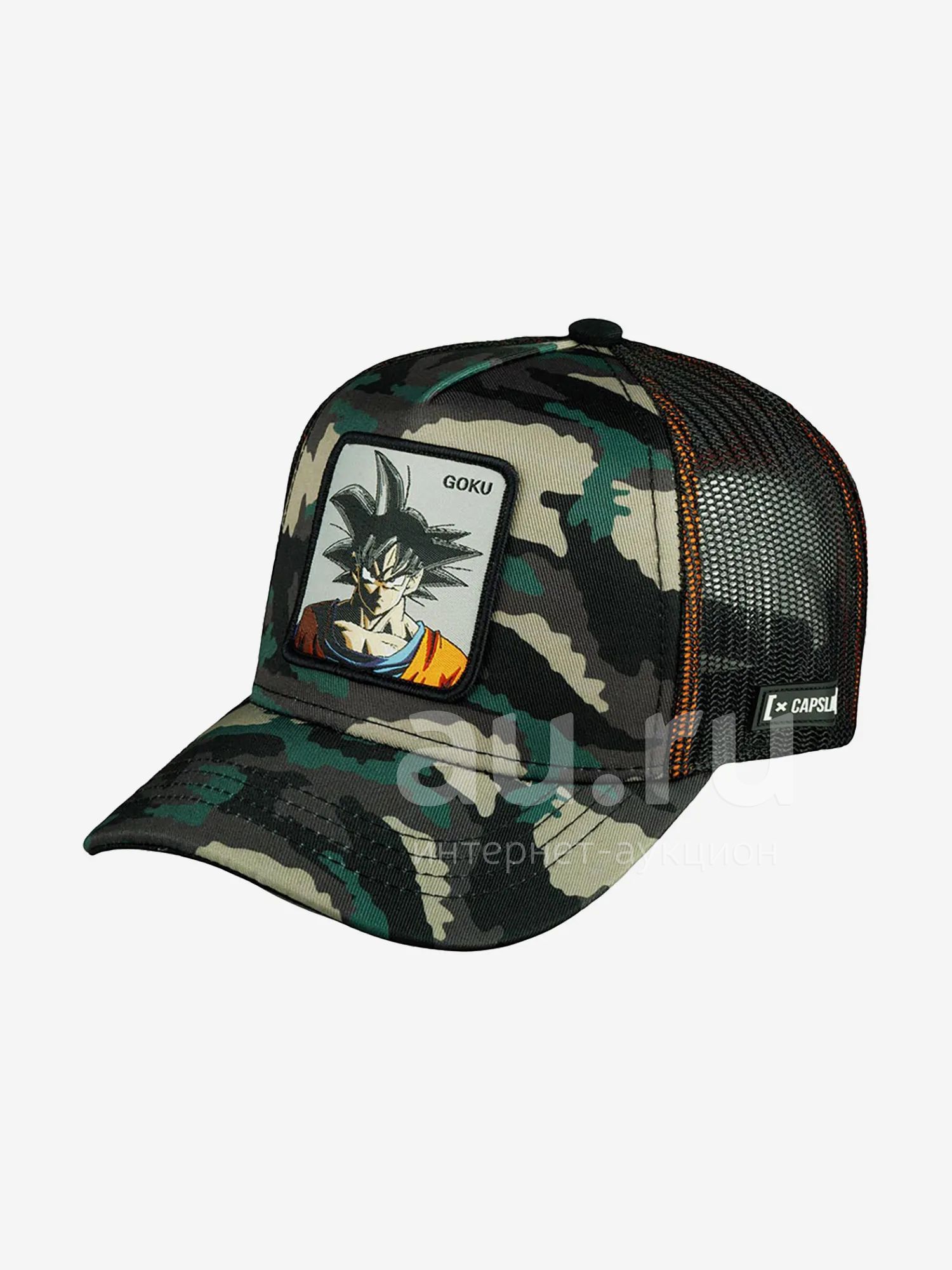 Бейсболка Goku из коллекции Dragon Ball. Бейсболка сшита из полиэстера и хлопка. Твердая передняя панель и козырек выполнены из ткани с камуфляжным принтом. Сетка, пуговка на макушке и внутренняя часть козырька черные. Модель украшает нашивка с Гоку — главным героем манги "Драконий жемчуг" — и соответствующей надписью. Сбоку на сетке — круглая тканевая нашивка с изображением иероглифа, который Гоку носит на униформе после завершения тренировок по гравитации. С другой стороны — резиновый ярлычок с названием бренда. Размер бейсболки регулируется при помощи пластиковой застежки. Рядом — резиновый оранжевый ярлычок с логотипом бренда. Внутренние швы обшиты брендированной тканью. Длина козырька 6.5 см, глубина бейсболки 13 см.