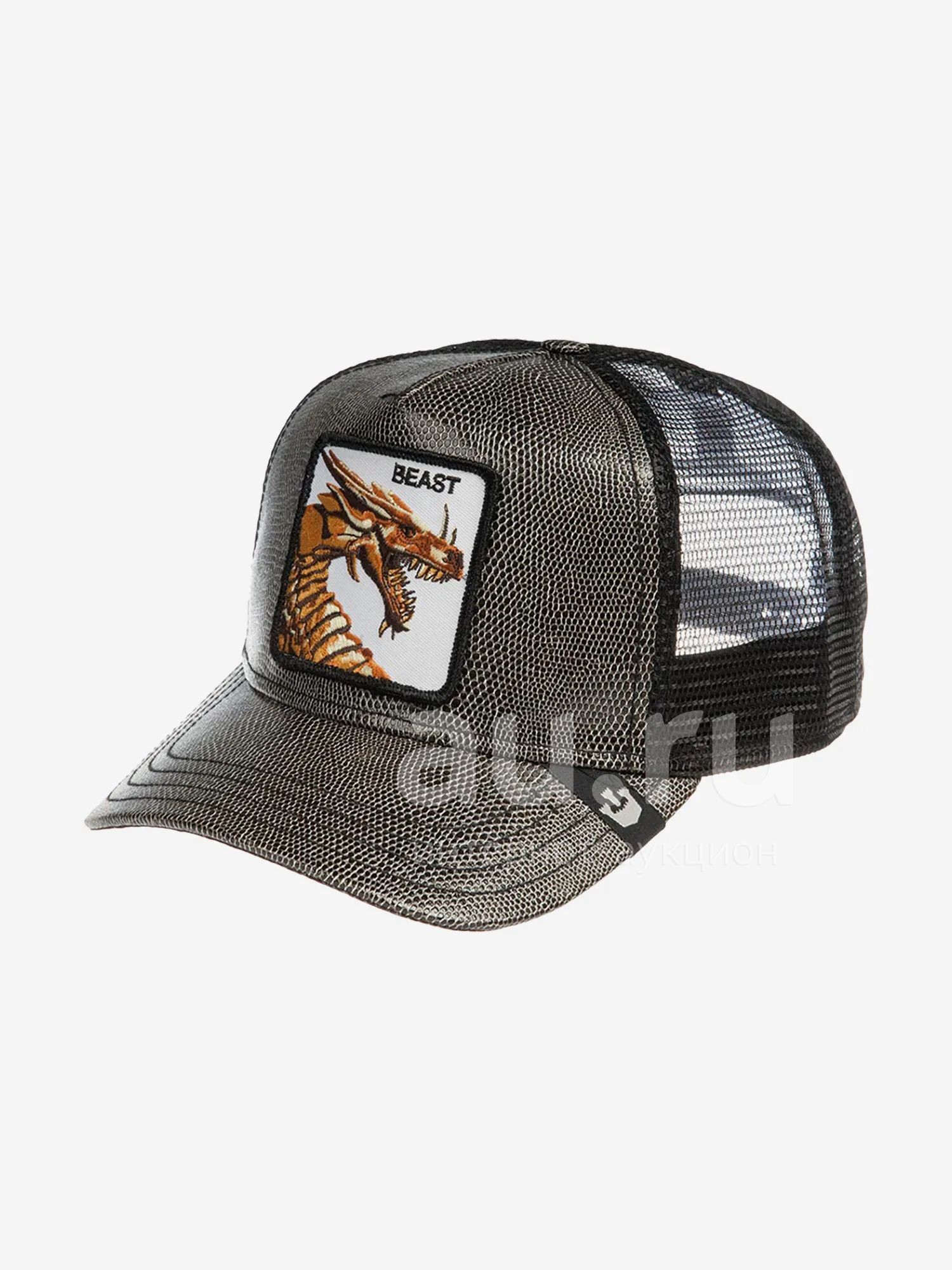 Бейсболка с драконом Fire Breather из культовой коллекции Animal Farm. На передней панели бейсболки, выполненной из блестящей искусственной кожи, — нашивка с изображением дракона и надписью Beast, которая имеет 2 значения. В классическом переводе она означает "зверь", а в американском сленге так описывают человека, чрезвычайно талантливого во всем, что он делает, который на пути к победе демонстрирует решимость, преданность делу и стойкость. Внутри изогнутый козырек обтянут тканью с необычным принтом — изображением молний на лиловом фоне. Снаружи козырек дополнен ярлычком с логотипом бренда. Размер бейсболки регулируется с помощью пластиковой застежки. Длина козырька 7 см, глубина 11 см.