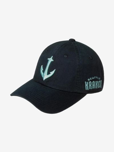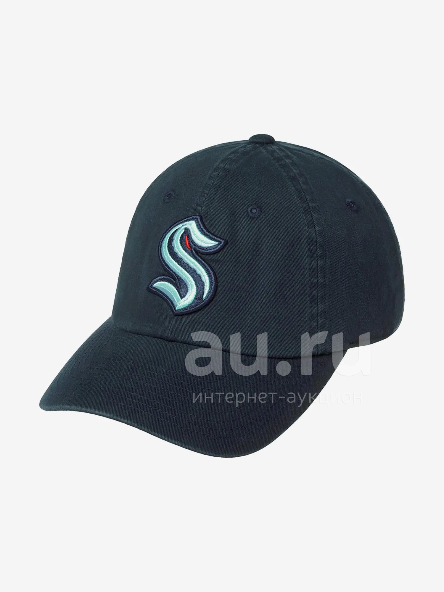 Американская бейсболка Seattle Kraken из серии Blue Line. Бейсболка сшита из темно-синего хлопка. На передней панели вышит логотип американского хоккейного клуба "Сиэтл Кракен", созданного в 2021 году и вступившего в НХЛ. Логотип представляет собой сине-голубую букву S, разрезаемую щупальцем Кракена — мифического морского существа, похожего на моллюска. Размер бейсболки регулируется с помощью текстильного ремешка с металлической пряжкой и кнопкой. Для вентиляции предусмотрены люверсы. Длина козырька 7 см, глубина бейсболки 11 см.