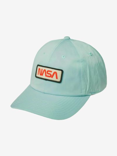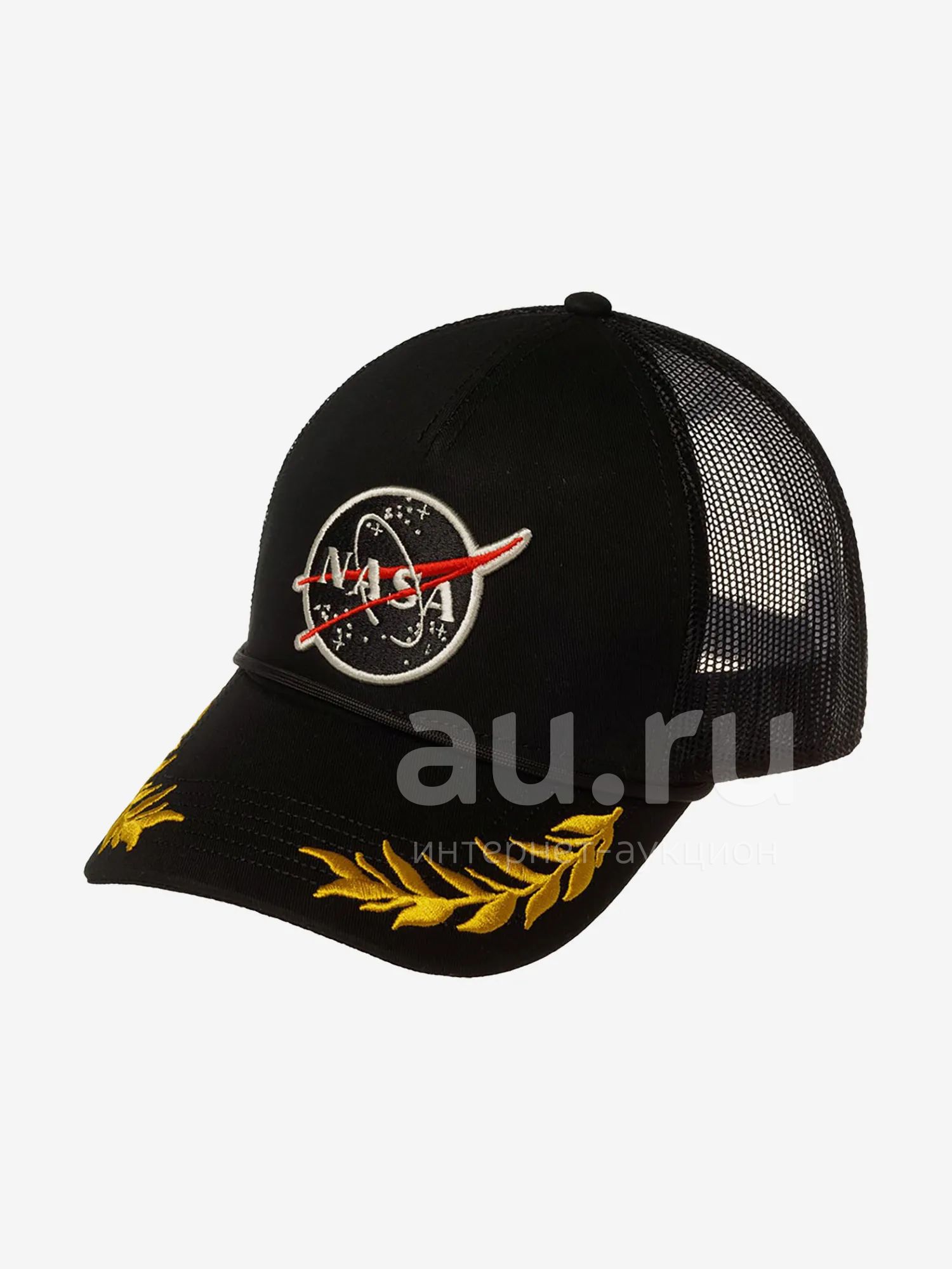 Американская бейсболка NASA из серии The General. Бейсболка с сеточкой сшита из черного хлопка. На жесткой передней панели вышита 1-я эмблема NASA (Национальное управление по аэронавтике и исследованию космического пространства), получившая в народе название "фрикаделька". Круг с надписью NASA символизирует планету, звезды — космос, красное крыло — воздухоплавание, а орбита — космические путешествия. Козырек украшен 2 вышитыми золотыми ветвями и черным шнурком. Размер головного убора регулируется с помощью пластиковой застежки. Длина козырька 7 см, глубина бейсболки 11 см.