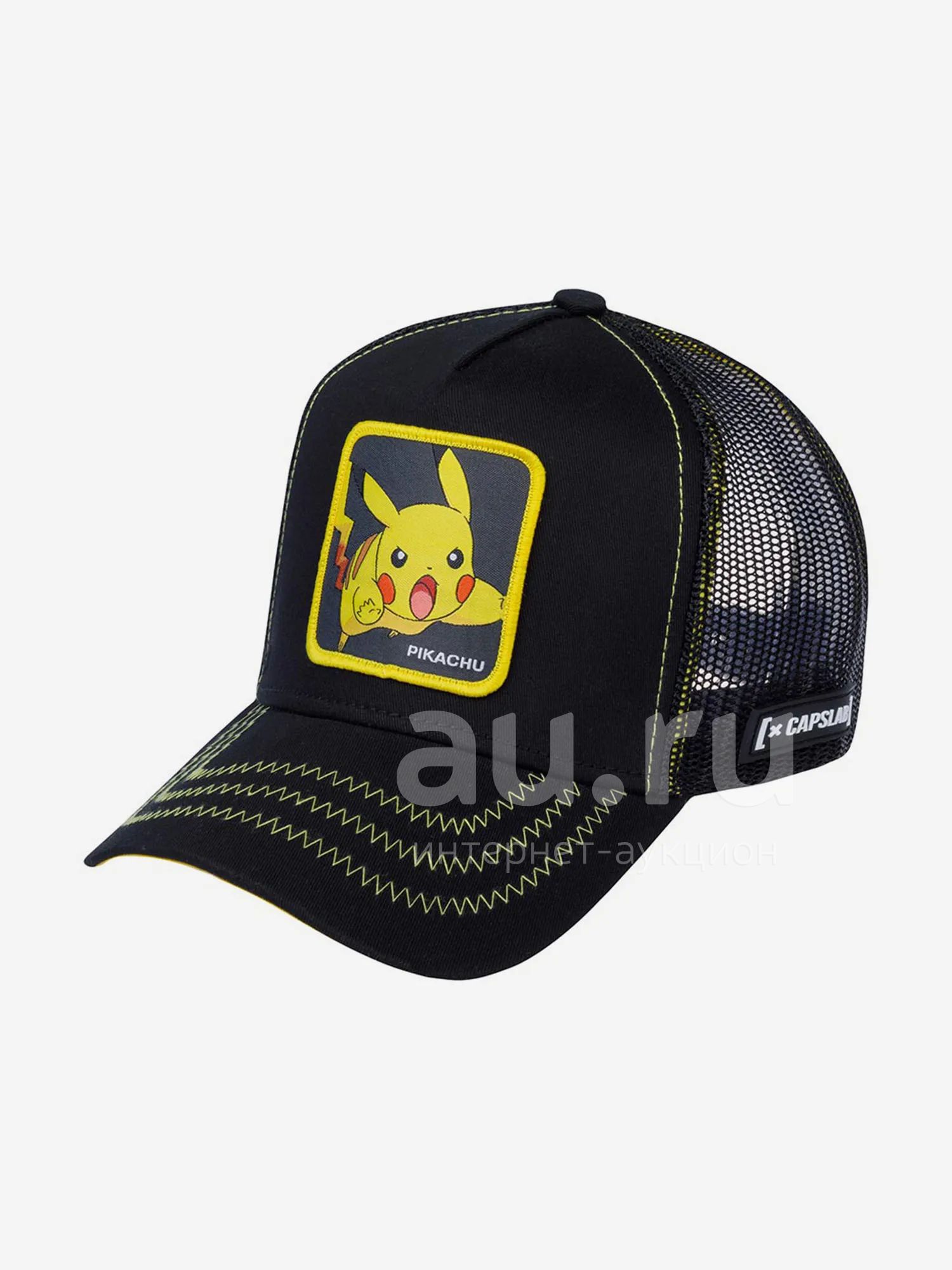 Бейсболка Pikachu из коллекции Pokemon. Черную хлопковую бейсболку с сеточкой украшает самый известный покемон Пикачу. Черный козырек дополнен контрастной зигзагообразной строчкой. Сбоку на сеточке — нашивка с хвостом Пикачу, похожим на молнию. Внутренняя сторона козырька выполнена в желтом цвете. Размер головного убора регулируется при помощи пластиковой застежки. Отличительные знаки бренда — резиновые ярлычки с логотипом и надпись Capslab на внутренних швах. Длина козырька 6.5 см, глубина бейсболки 13 см.