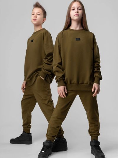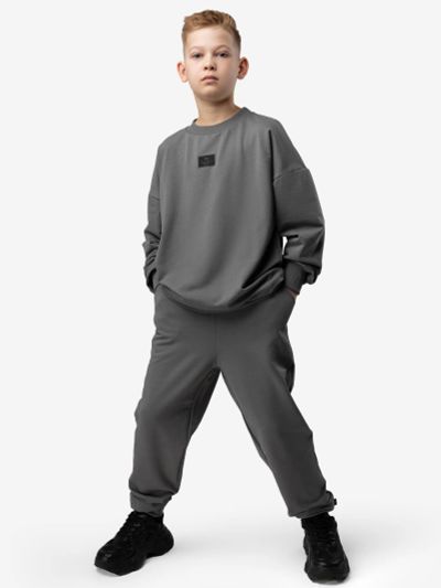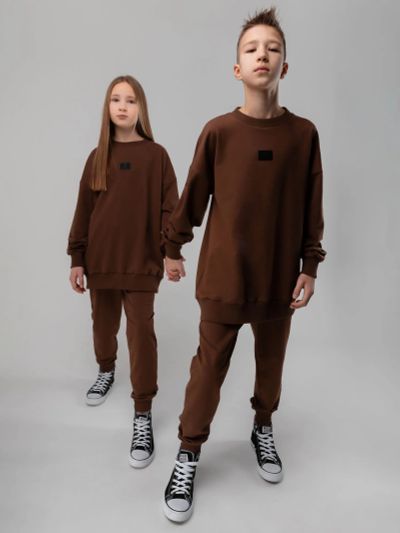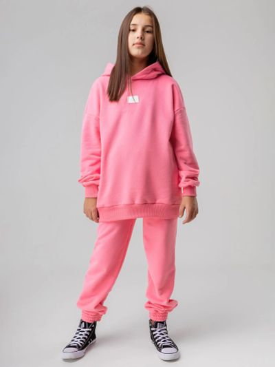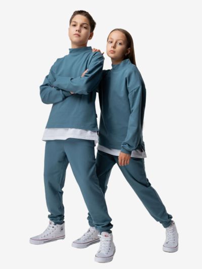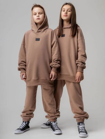 Костюм для детей школьного возраста. Толстовка (худи) без застежек, свободный покрой, несъемный капюшон, длинный рукав со спущенным плечом. Свободные брюки, низ на манжетах, карманы с отрезным бочком. Футер-двухнитка (92% хлопок, 8% лайкра).