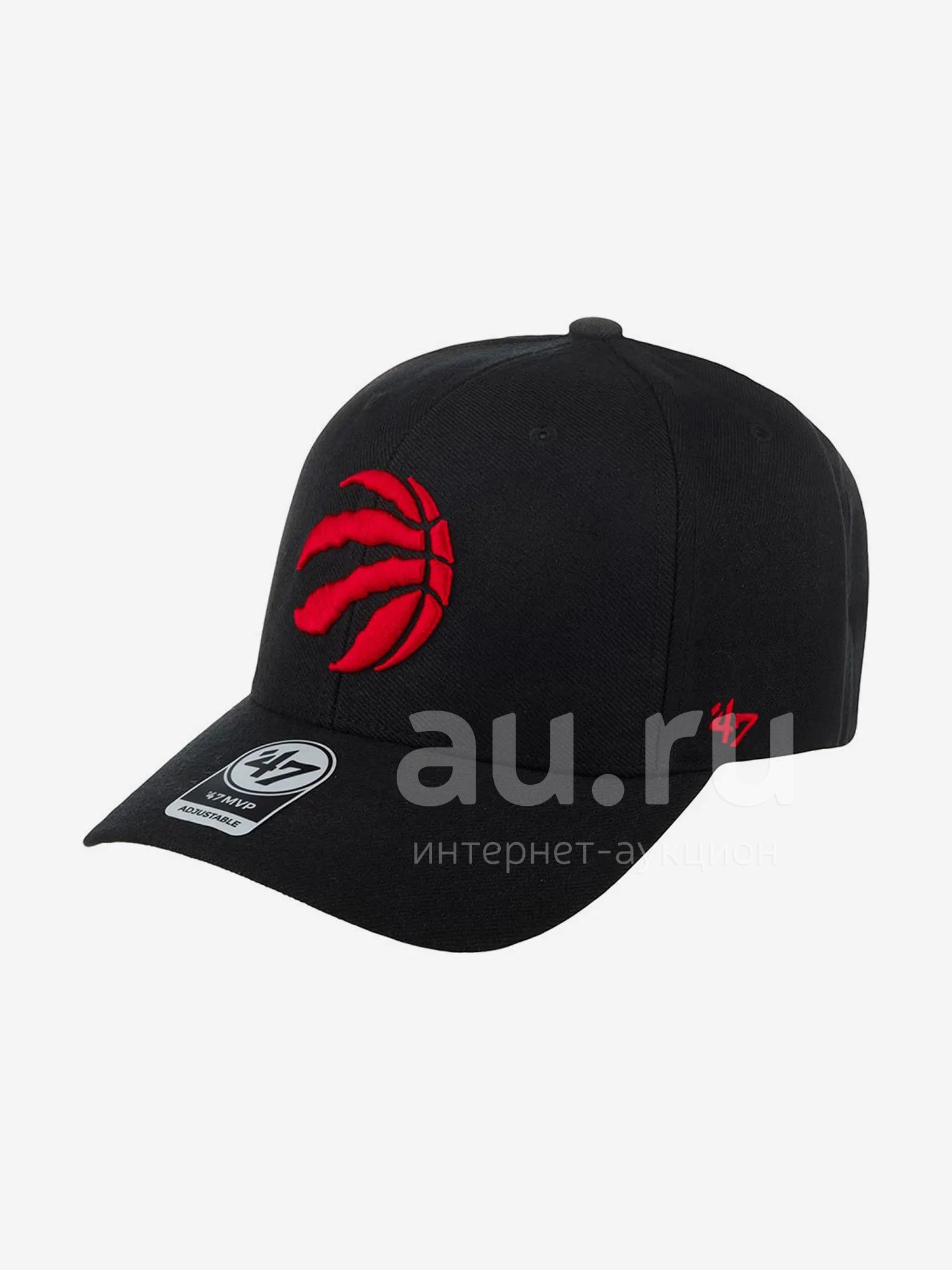 Черная бейсболка Toronto Raptors с изогнутым козырьком, твердой передней панелью и глубокой посадкой. Модель сшита из ворсистого смесового материала, состоящего из акрила и шерсти. На передней панели — объемная вышивка логотипа канадской профессиональной баскетбольной команды Toronto Raptors в виде красного силуэта баскетбольного мяча. Сбоку красными нитками вышита цифра 47, отсылающая к названию бренда. Предусмотрены люверсы для вентиляции. Размер регулируется с помощью тканевой застежки-липучки, на ее поверхности — красная вышивка Raptors с серой окантовкой. Внутри по окружности головы вшита черная лента с мягким наполнителем, на ленте — нашивки бренда и Лиги. Длина козырька 7 см, глубина 12 см.