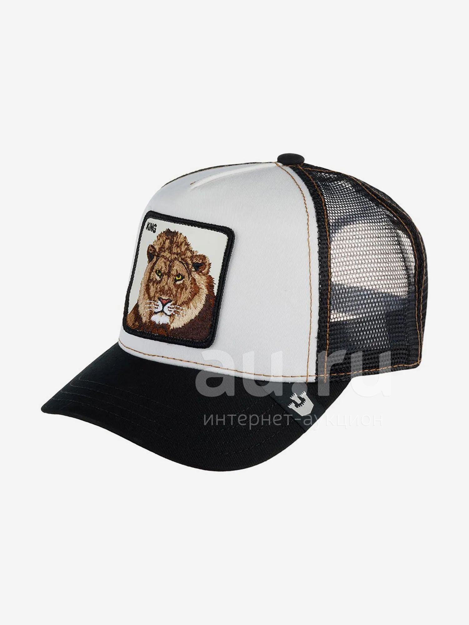 Бейсболка со львом Mane Man из культовой коллекции Animal Farm. На передней панели черно-белой бейсболки с коричневой отстрочкой — нашивка из экокожи с изображением льва и надписью King, что переводится как "царь, король". Также слово King употребляется среди мужчин для того, чтобы выразить друг другу уважение. На изогнутом козырьке — ярлычок с логотипом бренда. Размер бейсболки регулируется с помощью пластиковой застежки. Длина козырька 7 см, глубина бейсболки 11 см. Создатели бренда в коллекциях 2022 года обновили систему защиты от подделок: добавили текстильный ярлычок у застежки и брендированные швы, а также изменили дизайн фирменной нашивки внутри.