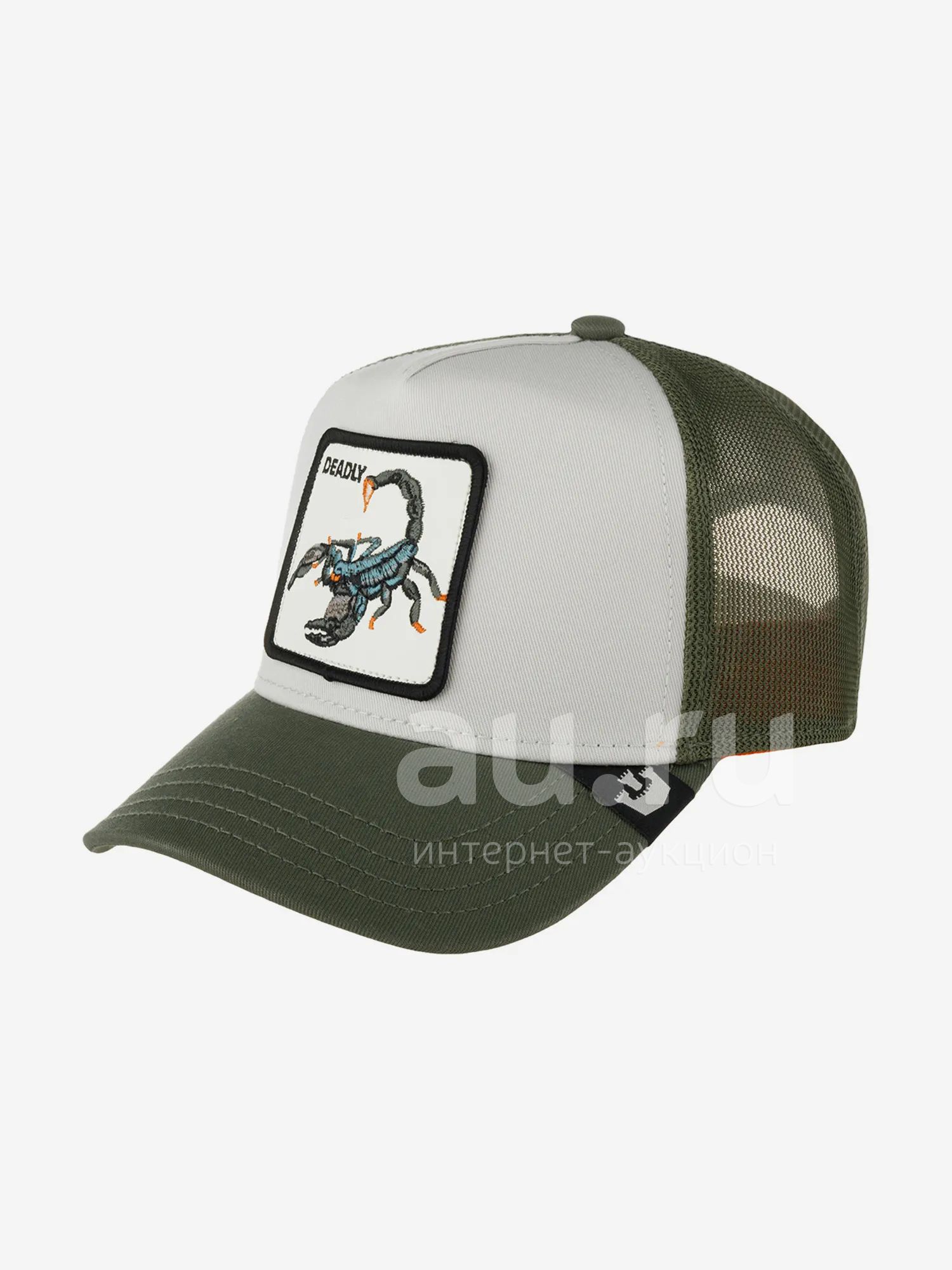 Бейсболка с плотной сеточкой оливкового оттенка Deadly из культовой коллекции Animal Farm от американского бренда Goorin Brothers. На передней твердой бежевой панели — белый патч из экокожи, на котором вышиты скорпион и надпись Deadly, "опасный". Бейсболки Goorin Bros. — эпатаж в духе современной молодежи. На изогнутом козырьке оливкового оттенка — ярлычок с логотипом бренда. Размер бейсболки регулируется с помощью пластиковой застежки. Внутри махровая оранжевая лента для комфортной посадки головного убора. Длина козырька 6.5 см, глубина 11 см. Создатели бренда в своих коллекциях с 2022 года обновили систему защиты от подделок: добавили текстильный ярлычок у застежки и брендированные швы, а также изменили дизайн фирменной нашивки внутри.