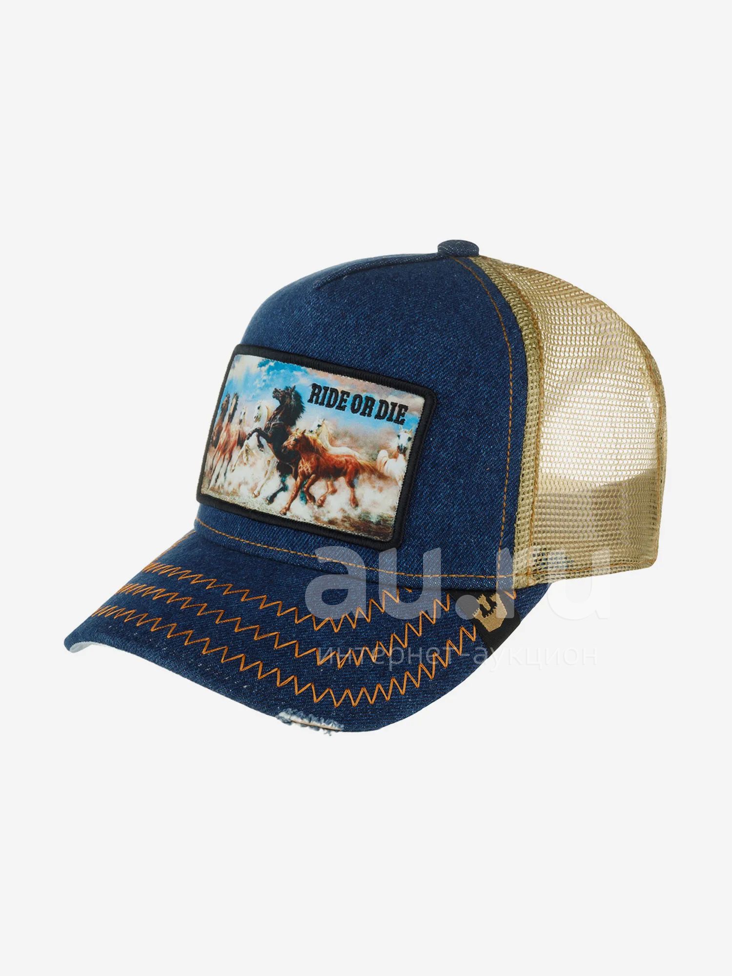 Эффектная бейсболка с тонкой шелковистой сеточкой из коллекции Rodeo от культового американского бренда Goorin. Передняя твердая панель и внешняя часть козырька выполнены из синего денима. Спереди брендированная медная кнопка и патч в стилистике ретрофотографии с изображением табуна лошадей и надпись Ride or die, эту фразу используют в значении "идти до конца". На козырьке — дизайнерские прорези и зигзагообразные строчки, его изнанка выполнена из гладкой ткани с принтом с изображением пустынного пейзажа и надписью с датой основания бренда — 1895 год. Размер бейсболки регулируется с помощью светло-желтой пластиковой застежки. Внутри для комфортной посадки по окружности головы предусмотрена мягкая трикотажная лента. Изнанка передней панели обшита гладкой светло-коричневой тканью. Длина козырька 6 см, глубина 11 см. Создатели бренда в своих коллекциях с 2022 года обновили систему защиты от подделок: добавили текстильный ярлычок у застежки и брендированные швы, а также изменили дизайн фирменной нашивки внутри.