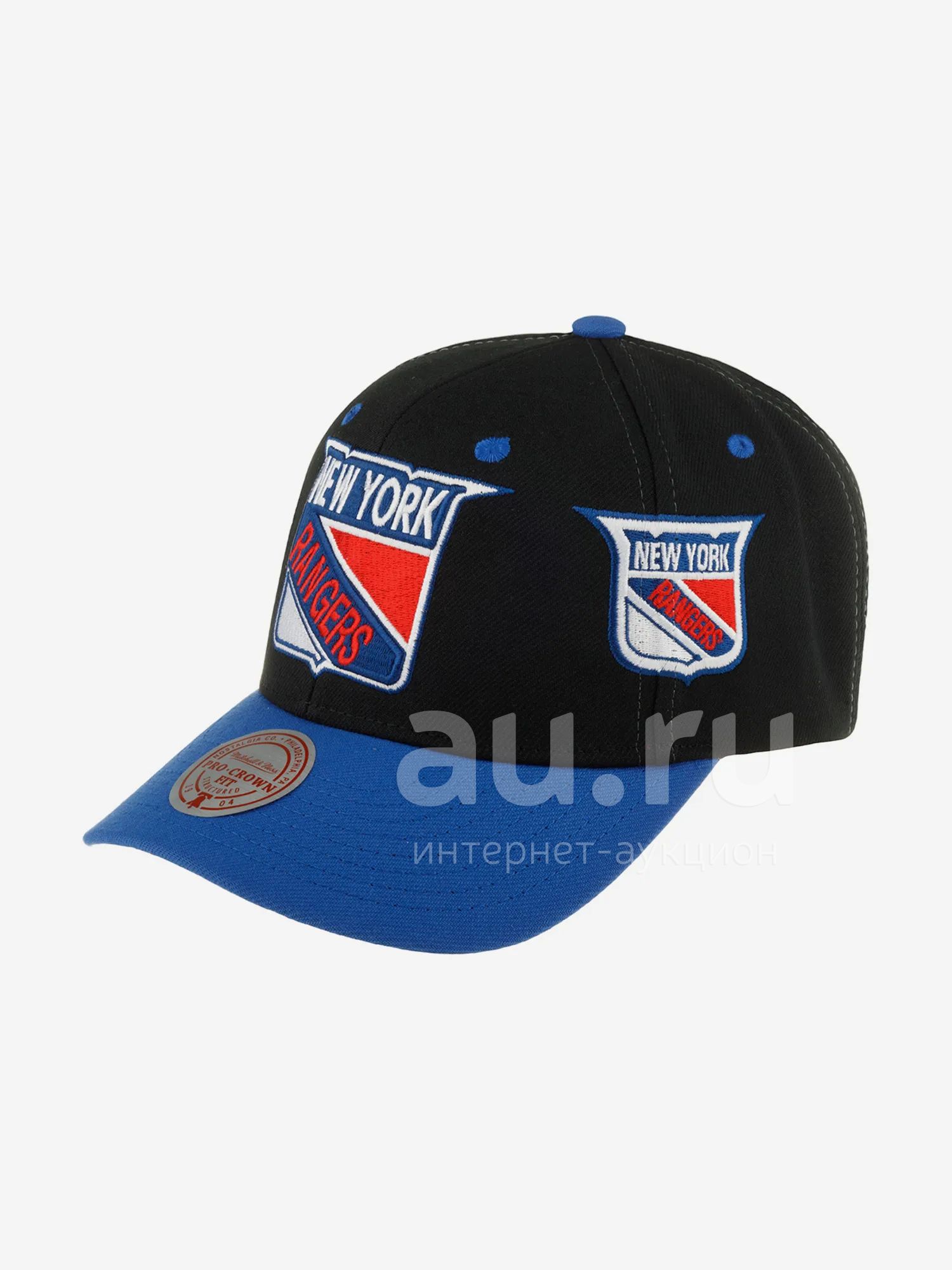 Бейсболка New York Rangers Stadium NHL от американского бренда Mitchell & Ness. Модель со слегка зауженным сверху черным куполом и чуть изогнутым синим козырьком выполнена из плотного полиэстера. На твердой передней панели — частично объемный логотип хоккейной команды New York Rangers. По бокам — вышивки с символикой клуба. Изнанка козырька светло-серая. Размер регулируется синей пластиковой застежкой. Люверсы, пуговка на макушке и вышивка с названием бренда сзади синего цвета. Внутри по окружности головы вшита мягкая лента с наполнителем для комфортной посадки. Изнаночные швы обшиты брендированной тканью. Длина козырька 7 см, глубина 12 см.