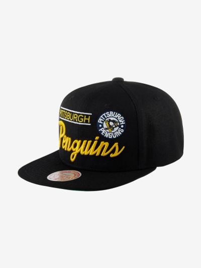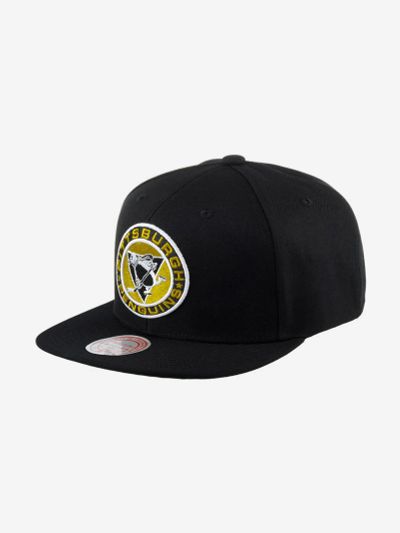 Бейсболка Pittsburgh Penguins NHL от американского бренда Mitchell & Ness. Купол выполнен из черного бархатистого плотного материала, слегка изогнутый козырек и пуговка — из желтого вельвета. На твердой передней панели — объемный логотип хоккейного клуба "Питтсбург Пингвинз". Изнанка козырька светло-серая. Внутри по окружности головы вшита мягкая лента с наполнителем для комфортной посадки. Размер регулируется желтой пластиковой застежкой. Предусмотрены люверсы для вентиляции. Сзади — светло-серая вышивка с названием бренда. Внутренние швы обшиты брендированной тканью. Длина козырька 7 см, глубина 12 см.