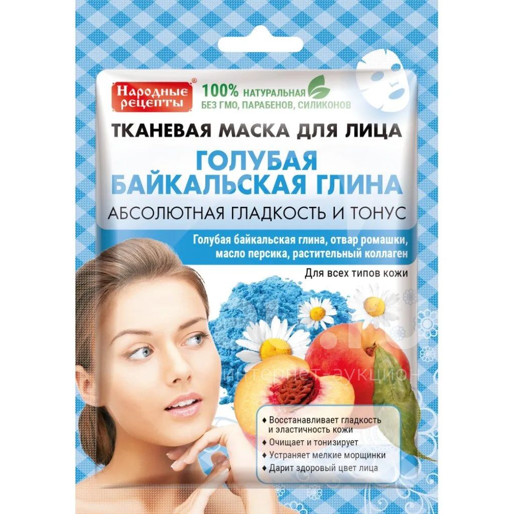 Современная натуральная тканевая маска Народные рецепты на основе голубой байкальской глины с растительным коллагеном. Состав мгновенно восстанавливает гладкость и упругость кожи, насыщает витаминами, дарит здоровый и ухоженный вид.