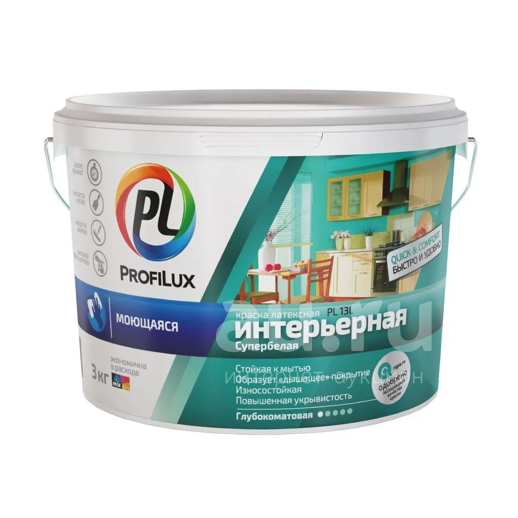 Краска воднодисперсионная, Profilux, PL-13L, латексная, универсальная, моющаяся, влагостойкая, матовая, супербелая, 3 кг