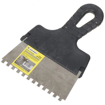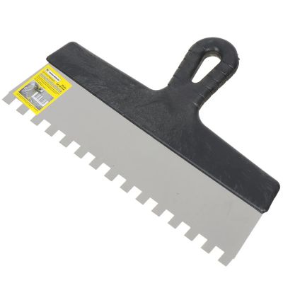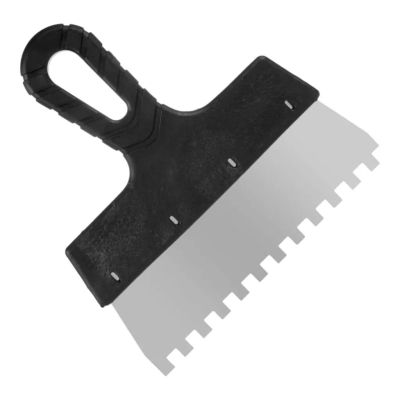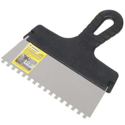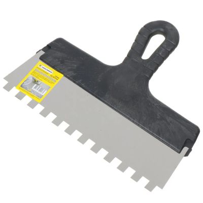 Фасадный шпатель Мастер предназначен для нанесения клеевых составов, цементных монтажных смесей при укладывании кафельной плитки, приклеивании стеновых панелей. Полотно с зубьями подойдет для облицовки стен крупными плитами. Прочное полотно из нержавеющей стали, позволяет наносить раствор с большой вязкостью. Рукоятка выполнена из пластика и имеет эргономическую форму, что обеспечивает удобство при работе.
