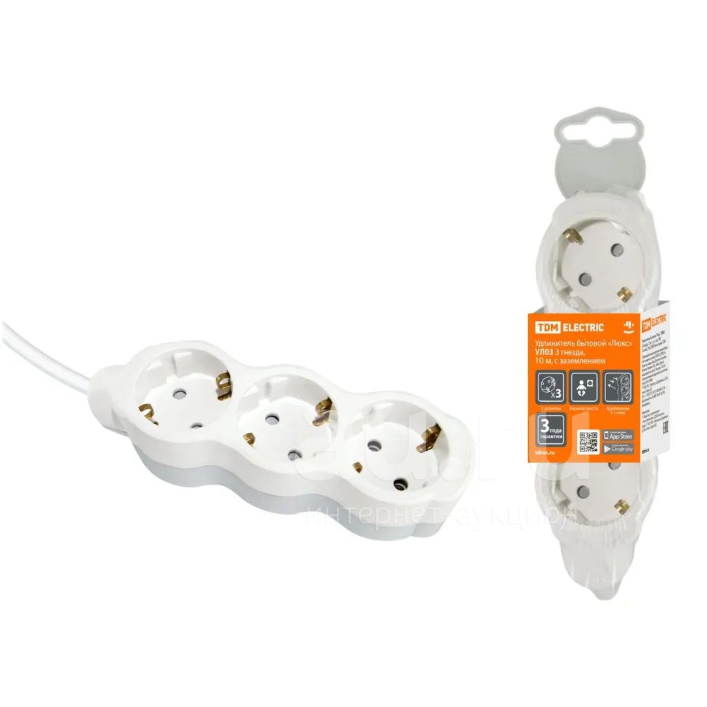 Удлинитель бытовой 3 гнезда, 10 м, ПВС, 3х1 мм², с заземлением, 16 А, бело-серый, TDM Electric, Люкс, SQ1303-0282