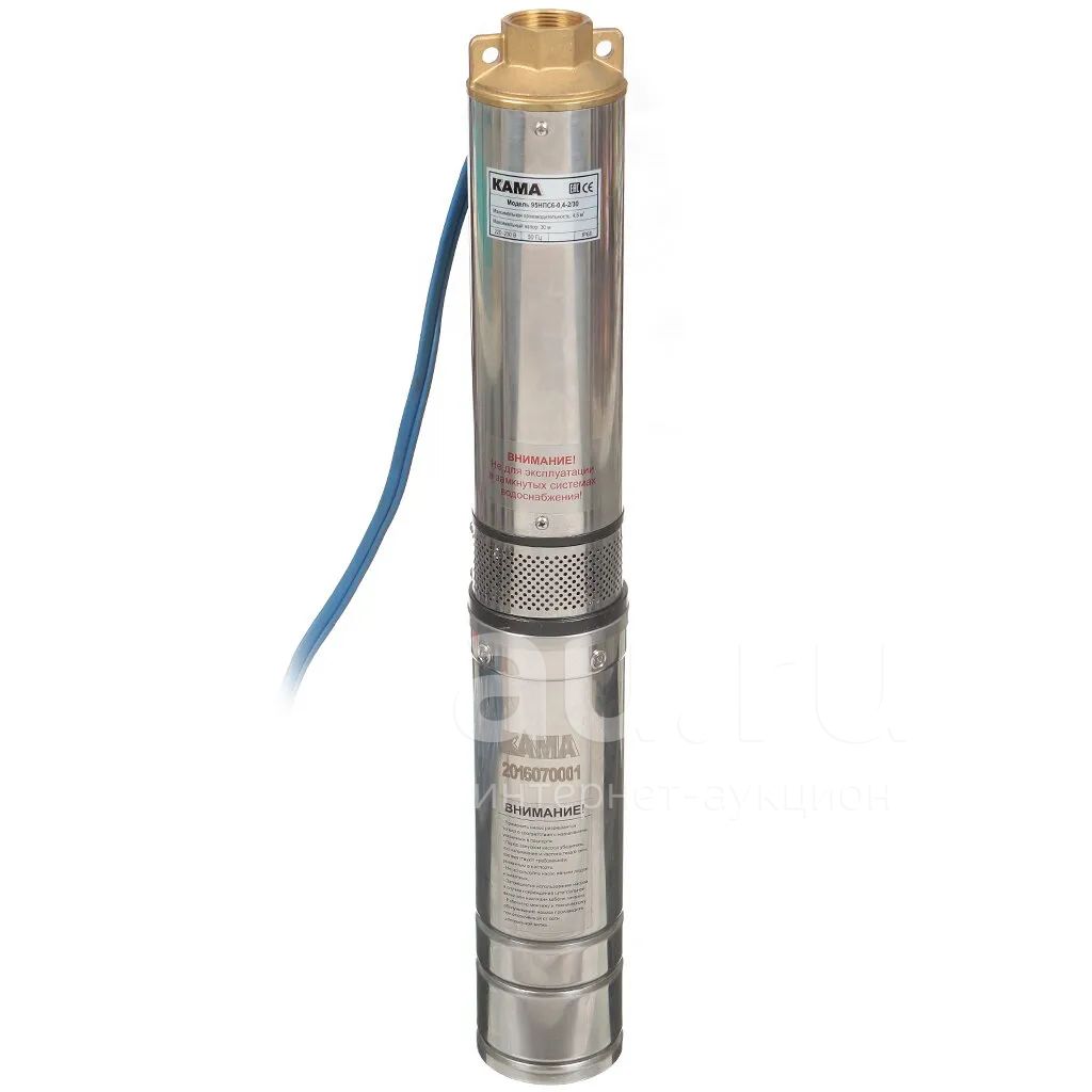 Насос скважинный, Кама, 1 1/4 '', нижний забор, 15 м, 550 Вт, диаметр 75 мм, глубина погружения 35 м, максимальный напор 50 м, 2.6 м³/ч, термозащита, 75НПС12-0,55-2/40