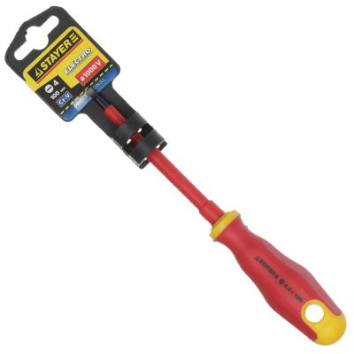 Используется при проведении монтажных и демонтажных работ с крепежными элементами под напряжением до 1000 Вт. Стержень изготовлен из высококачественной хромованадиевой стали со специальным изоляционным покрытием; наконечник намагничен и покрыт антикоррозийным составом. Отвертка оснащена удобной противоскользящей рукояткой. Двухкомпонентная рукоятка эргономичной формы и намагниченный наконечник , значительно повышают комфорт при работе. Покрытие-изоляционный материал.