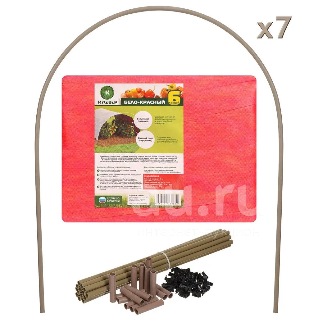 Парник 1.3х6х1 м, спанбонд, 60 г/м2, дуга 3.7 м, пластик, дуги в сборе, клипсы для крепления, красно-белый, Клевер