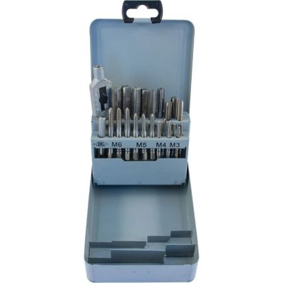 Набор инструмента «Ombra» предназначен для восстановления поврежденных и нарезания внутренних и наружных резьб размерами: M3X0.5, M3X0.6, M4X0.7, M4X0.75, M5X0.8, M5X0.9, M6X0.75, M6X1.0, M7X0.75,M7X1.0, M8X1.0, M8X1.25, M10X1.25, M10X1.5, M12X1.5, M12X1.75, 1/8NPT27. Режущие инструменты выполнены из высокоуглеродистой инструментальной стали твердостью HRC 40-55 и не предназначены для первичной обработки резьбовых поверхностей высокоуглеродистых сталей, металлов и материалов, сопоставимых по твердости.