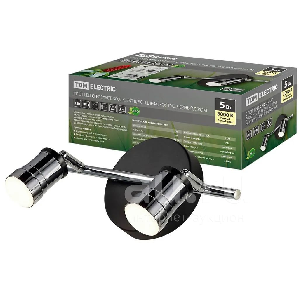 Светильник светодиодный, TDM Electric, Костус СНС, 5 Вт, на 2 лампочки, 3000 К, IP44, 230 В, 50 Гц, для ванной комнаты, черный, хром, SQ0358-0229