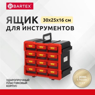 Ящик Bartex это незаменимый помощник для любого мастера. Он выполнен из прочного материала, который обеспечивает надёжную защиту содержимого от повреждений и влаги. Внутри ящика есть несколько отделений для удобного размещения всего необходимого.