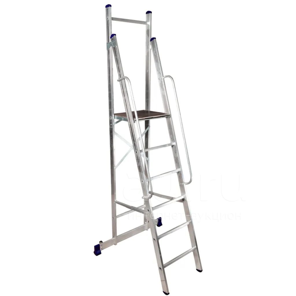 Стремянка-помост представляет собой свободностоящую переносную лестницу, имеющую сторону подъема (переднюю ногу), опорную сторону (заднюю ногу), рабочую площадку и раскладывающуюся для подъема на высоту. В верхней части задней ноги стремянки имеется поперечина, которая выполняет роль периллы и обеспечивает безопасность при работе. Для жесткости на задней ноге имеются диагонали. На задней ноге внизу находится стабилизатор без колес. Задняя и передняя ноги соединены между собой. Стремянка в рабочем положении надежно фиксируется рабочей площадкой и страховочными складывающимися металлическими стяжками. Рабочая площадка выполнена из влагостойкой ламинированной нескользящей фанеры, которая крепится на стальные уголки. Тетивы и ступени стремянки изготовлены из высокопрочного алюминиевого профиля. Ступени имеют рифленую поверхность. Массивные башмаки изготовлены из высокопрочного обрезиненного пластика.