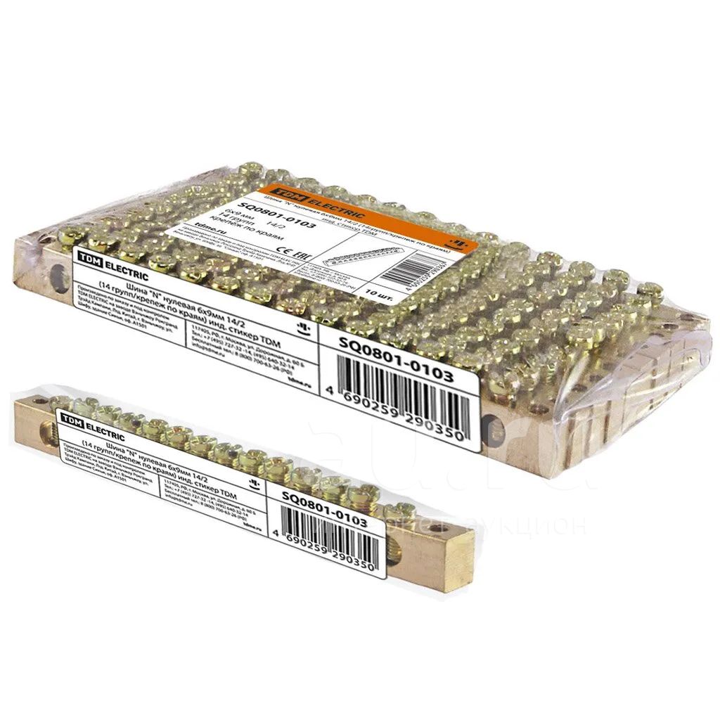 Шина нулевая N, винтовая, латунь, 14/2, 14 групп, крепеж по краям, 6х9 мм, 6-9 мм², TDM Electric, SQ0801-0103