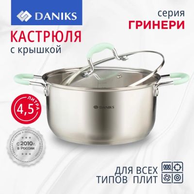 Кастрюля нержавеющая сталь, 4.5 л, с крышкой, крышка стекло, Daniks, Карлин, GS-01332G-22, индукция