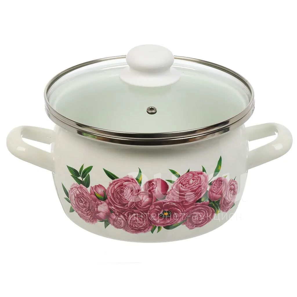 Кастрюля эмалированная сталь, 3 л, с крышкой, крышка стекло, цилиндр, Сантэкс, Пионы пурпур, 1-2430112, индукция