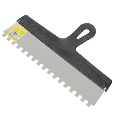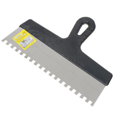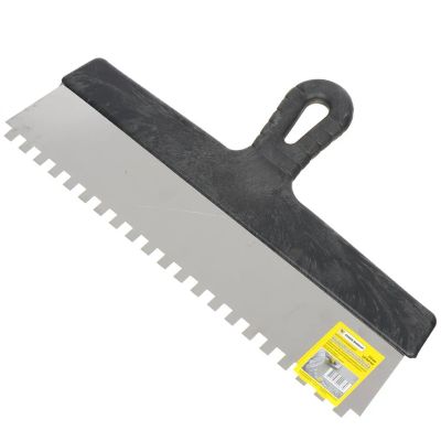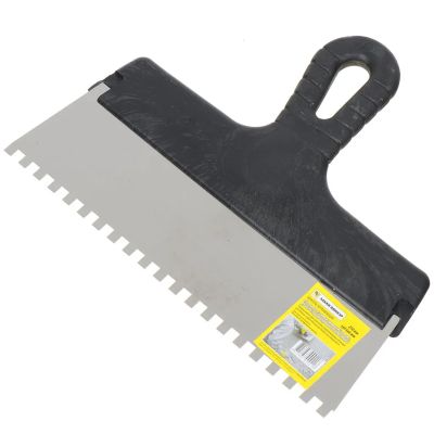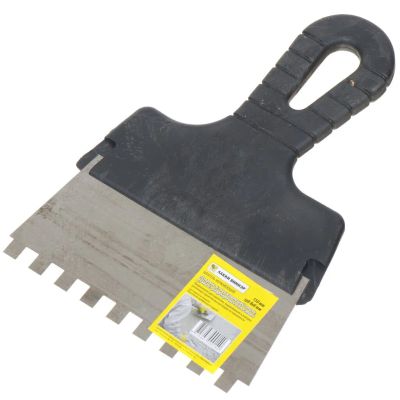 Предназначен для нанесения и выравнивания клеевых составов при укладке кафельной плитки, керамогранита, облицовочного камня. Рукоятка изготовлена из пластика черного цвета, полотно из пружинной стали с антикоррозийным покрытием.