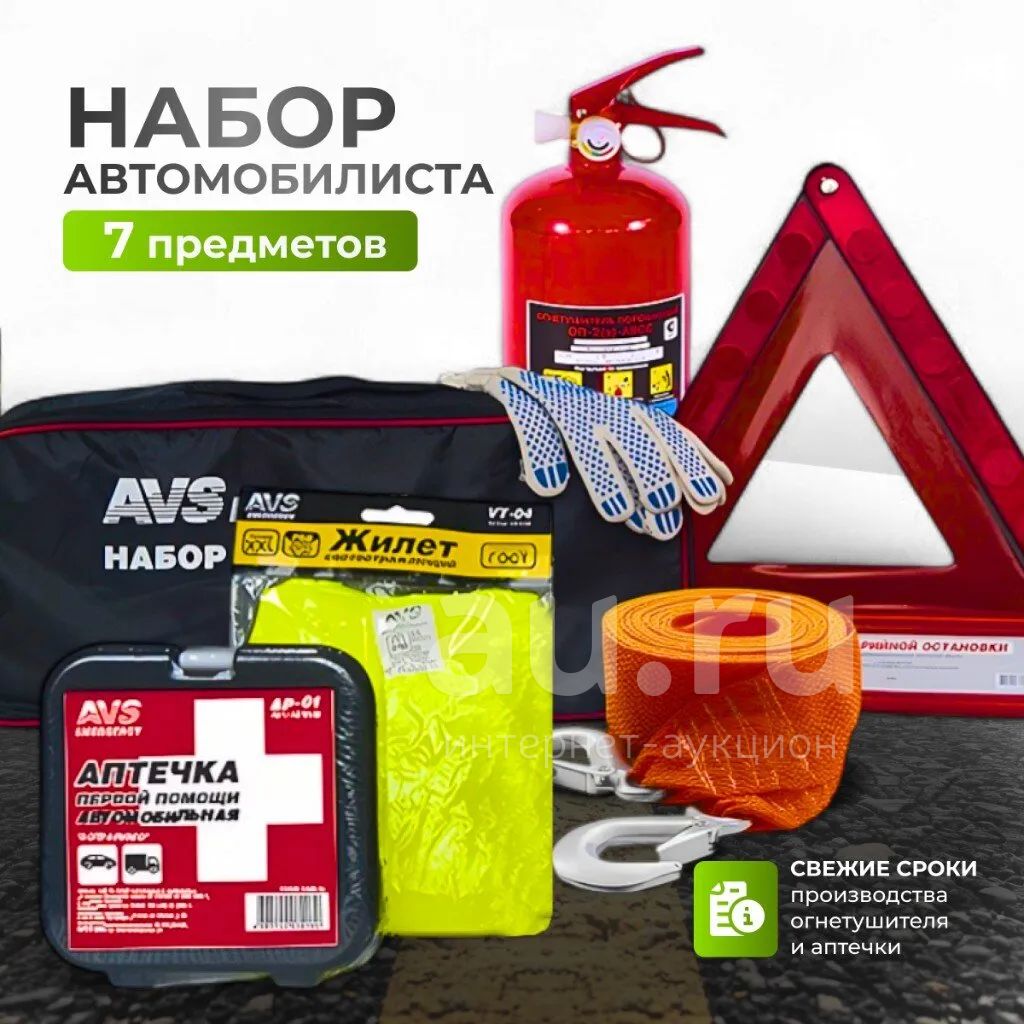 Автомобильный набор AVS Emergency в комплекте необходимые каждому автомобилисту принадлежности. В комплект включены средства первой необходимости: жилет светоотражающий, аптечка первой помощи автомобильная, знак аварийной остановки, трос буксировочный с крюками, перчатки ХБ с ПВХ, сумка "Набор автомобилиста", огнетушитель.