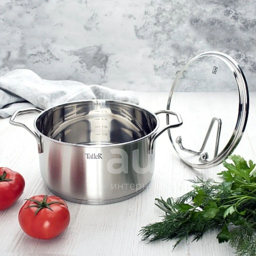 Кастрюля Taller Инесс 2 л из нержавеющей стали 18/10 с капсульным дном и стеклянной крышкой — оптимальное решение для индукционных и других плит. Готовьте супы, каши и пельмени без лишних хлопот.
