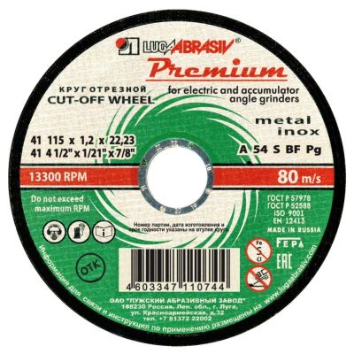 Круг отрезной по металлу, LugaAbrasiv, Long life, BF, диаметр 115х1 мм, посадочный диаметр 22.23 мм, зернистость A54, S 80 м/с