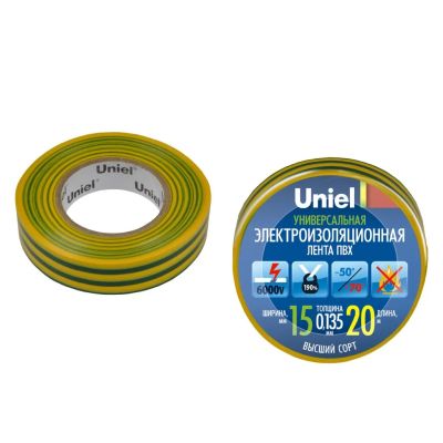 Изолента ПВХ, 15 мм, желто-зеленая, 10 м, Uniel, 04516