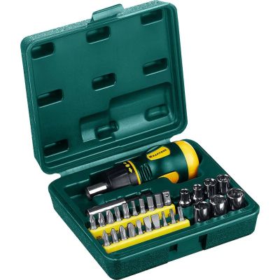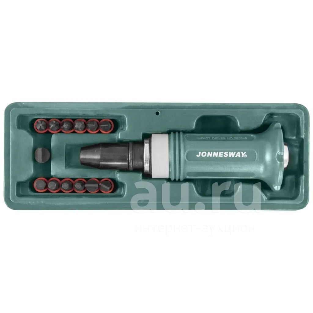 Ударно-поворотная отвертка с ТПР протектором, обеспечивающим надежное удержание инструмента и защиту руки оператора от возможных повреждений при работе. Привод отвертки изготовлен из хромомолибденовой стали. В комплект поставки также входят вставки-биты: РН1, РН2, РН3, РН4; Н4, Н5, Н6, Н8 и шлиц прямой (SL) 5, 6, 8, 10, 12 мм.