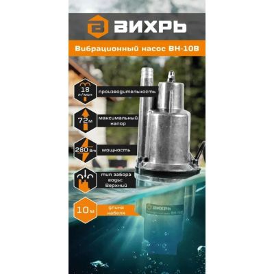 Насос вибрационный, Вихрь, верхний забор, 25 м, 280 Вт, глубина погружения 3 м, максимальный напор 72 м, 1.08 м³/ч, ВН-25В