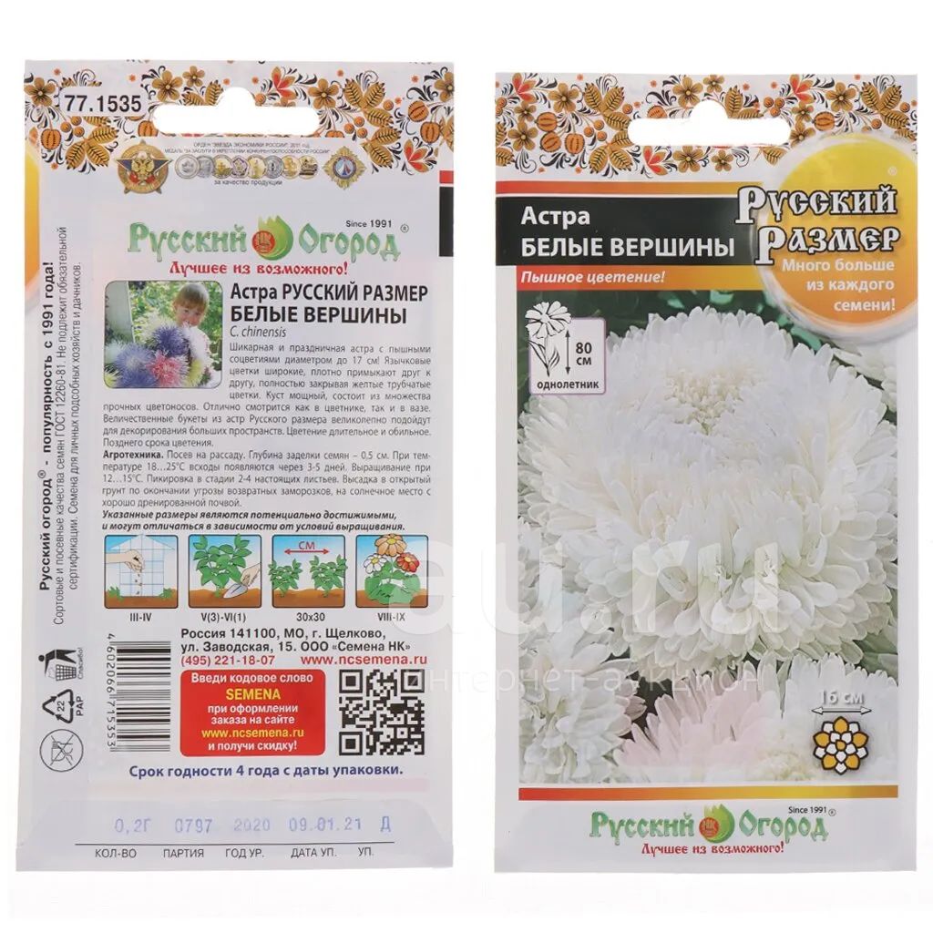 Семена Цветы, Астра, Белые вершины, 0.2 г, Русский размер, цветная упаковка, Русский огород