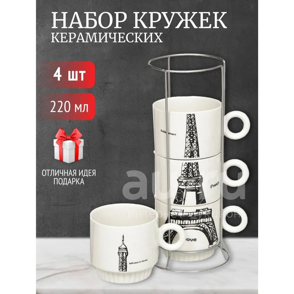 Набор керамических кружек 220 мл с дизайном «Эйфелева башня» (4 шт) и металлической подставкой — стиль для дома, удобство для подарка, практично для кухни.