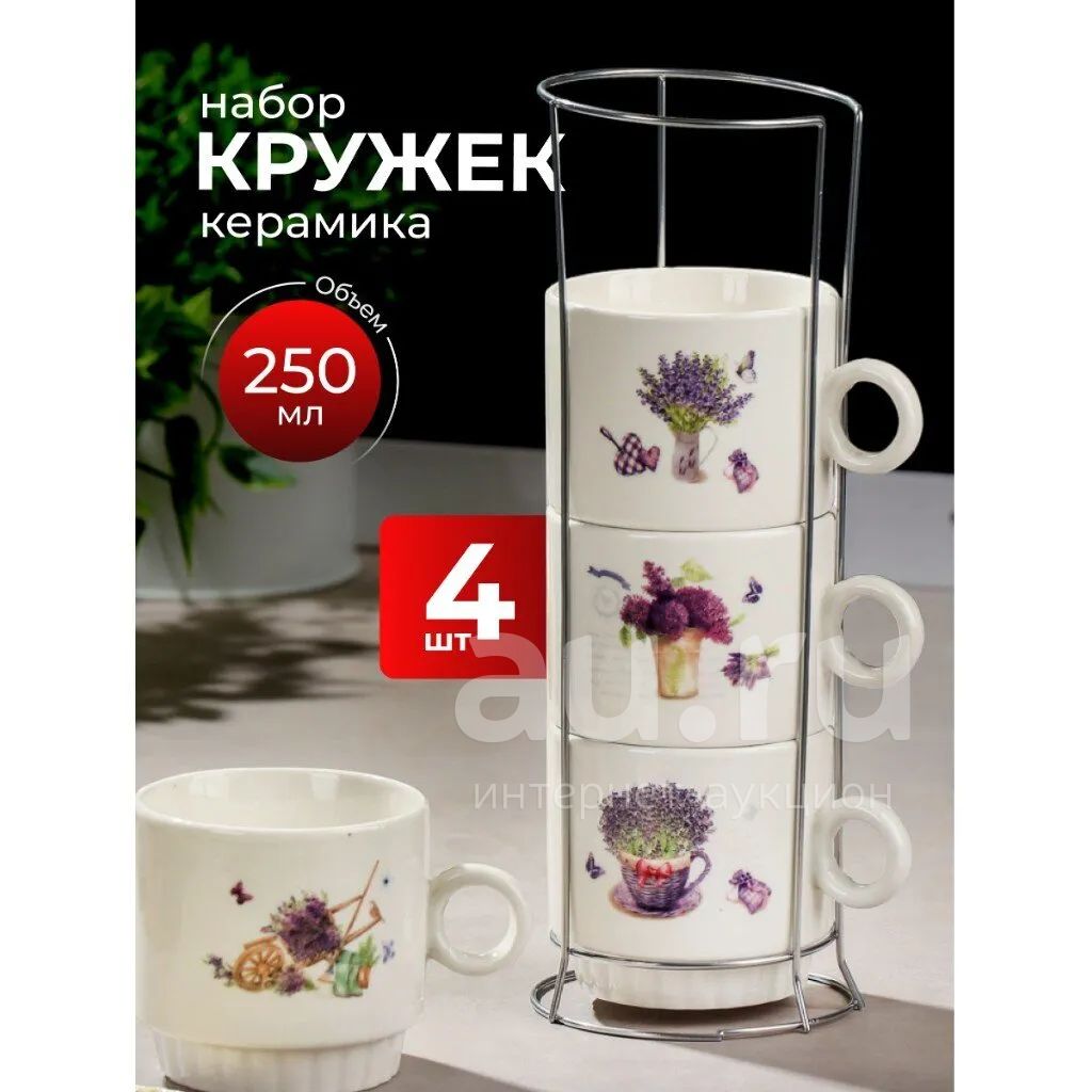 Набор керамических кружек «Лаванда» 250 мл (4 шт) с металлической подставкой — стиль для кухни и дачи, идеальный подарок и компактное хранение.