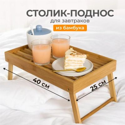 Столик из бамбука является отличной альтернативой тяжелым металлическим и не очень надежным пластмассовым столикам. Складные ножки позволяют быстро сделать из столика обычный поднос, а благодаря небольшим габаритам в сложенном состоянии, он не займет много места и легко разместится даже на небольшой кухне. Исключительные свойства бамбука обеспечат долговечность эксплуатации и эстетичный внешний вид. Бамбуковый сервировочный столик станет незаменимым помощником для организации чаепития или легких закусок в доме и на даче. Вы оцените его удобство в гостиной при просмотре фильма или интересной программы. Прекрасным утром побалуйте любимых завтраком в постели.