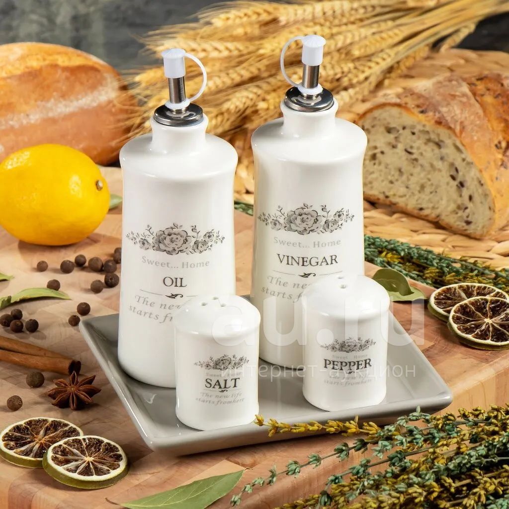Набор для специй, масла и уксуса "Классик" на керамической подставке с ручкой состоит из 5-ти предметов: 2-х бутылок, солонки с перечницей и керамической подставки. Этот набор - прекрасный пример высококачественной, удобной и лаконичной посуды для изящной сервировки стола. Бутылки и емкости для специй выполнены из прочной керамики. Бутылки имеют металлические наконечники с пластиковыми крышками. Наполнить емкости для специй можно через отверстие в донышке, которое надежно закрывается пластиковой пробкой.