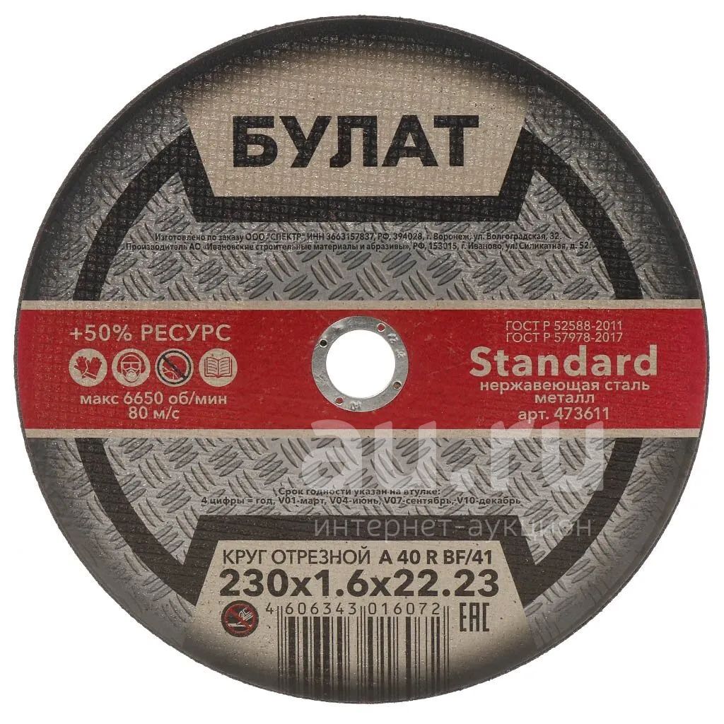 Круг отрезной по металлу, Булат, BF, диаметр 230х1.6 мм, посадочный диаметр 22.23 мм, зернистость A40, тип 41, R 80 м/с