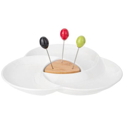 Менажница фарфор, дерево, 23х6.5 см, 4 секции, деревянная подставка, Lefard, Native, 263-1349