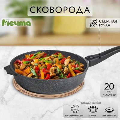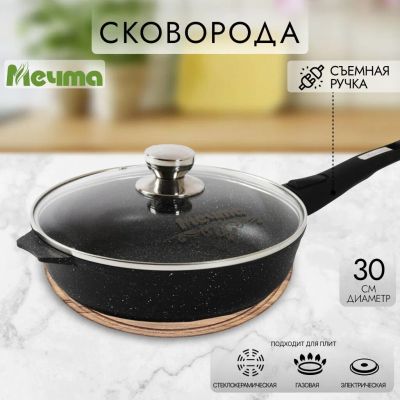 Сковорода литой алюминий 30 см Мечта Гранит black — антипригарная, глубокая, с удобной съемной ручкой. Идеальный выбор для дома и дачи: готовьте легко и без пригорания.
