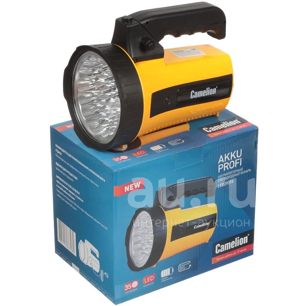 Фонарь ручной, встроенный аккумулятор, прожектор, Camelion, LED29315, зарядка от сети 220 В, пластик, желтый, 10469